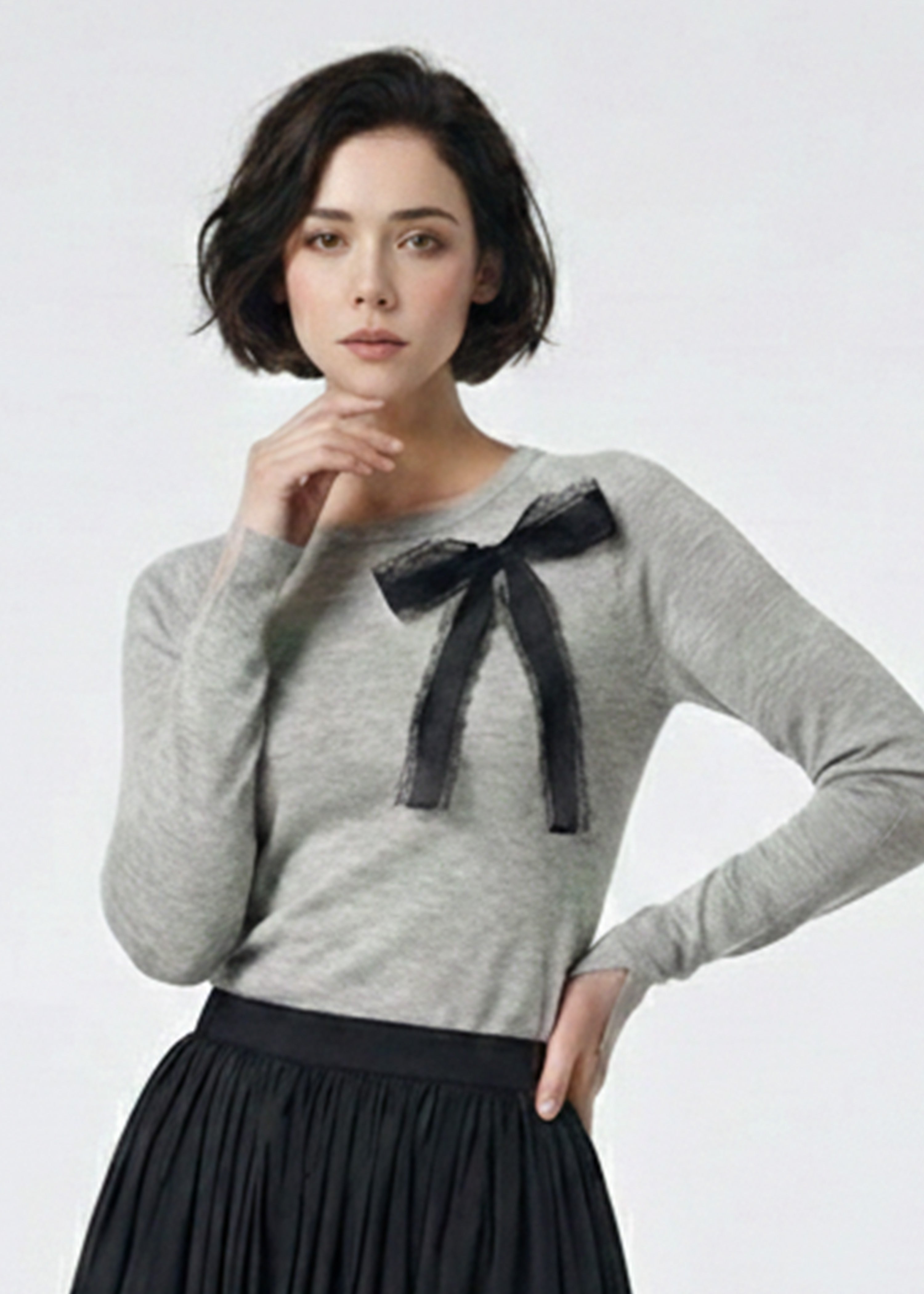 - This lightweight cashmere top is perfect for any season and an essential wardrobe staple that never goes out of style. Featuring a delicate tulle bow detail, it highlights the enduring beauty and durability of cashmere while adding a refined, feminine touch.