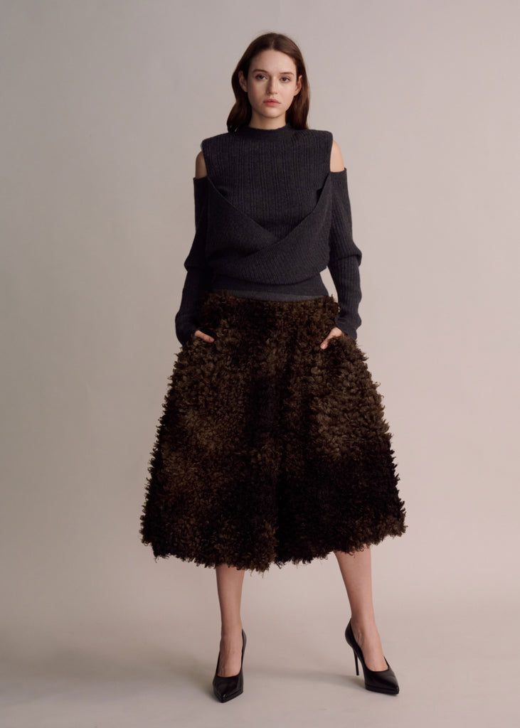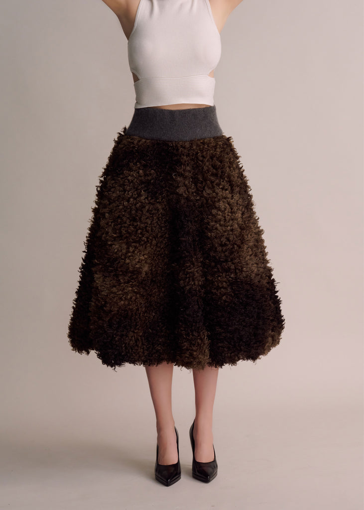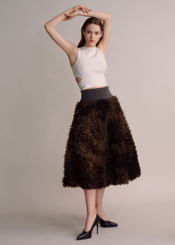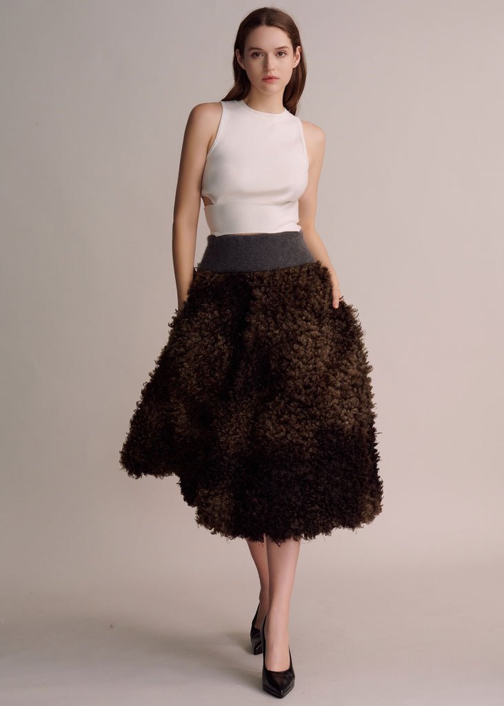- Blending sustainability with luxury, the Tammy skirt reflects the spirit of Connections. The plush vegan fur creates a bold, tactile statement, while the upcycled cashmere waistband adds softness and refinement. Designed for warmth and elegance, it embodies the beauty of transformation and conscious craftsmanship.
