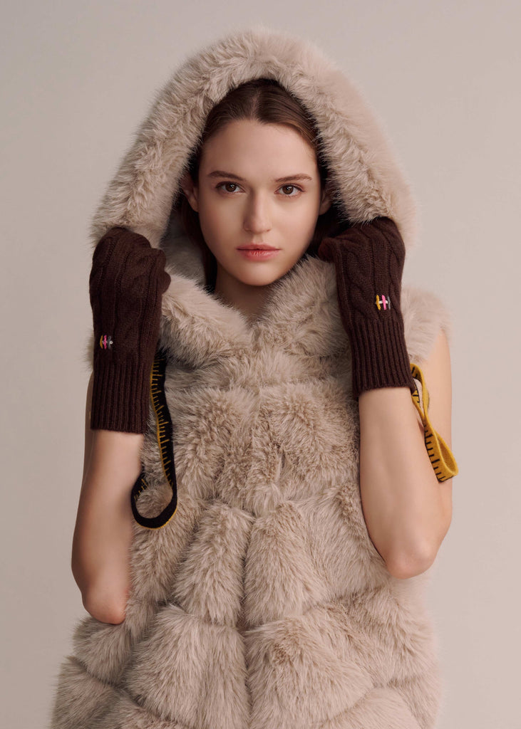 Cable Knit Cashmere Gloves with Adjustable Strap - Brown