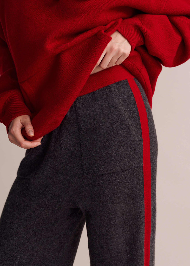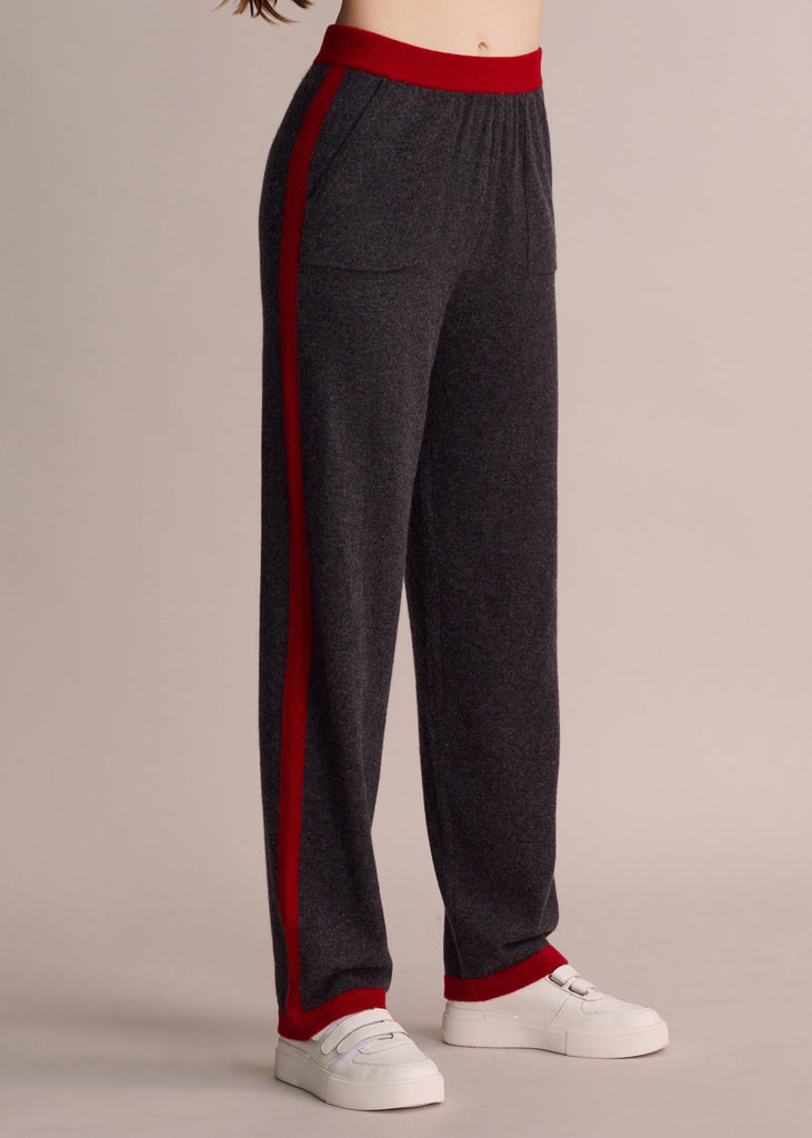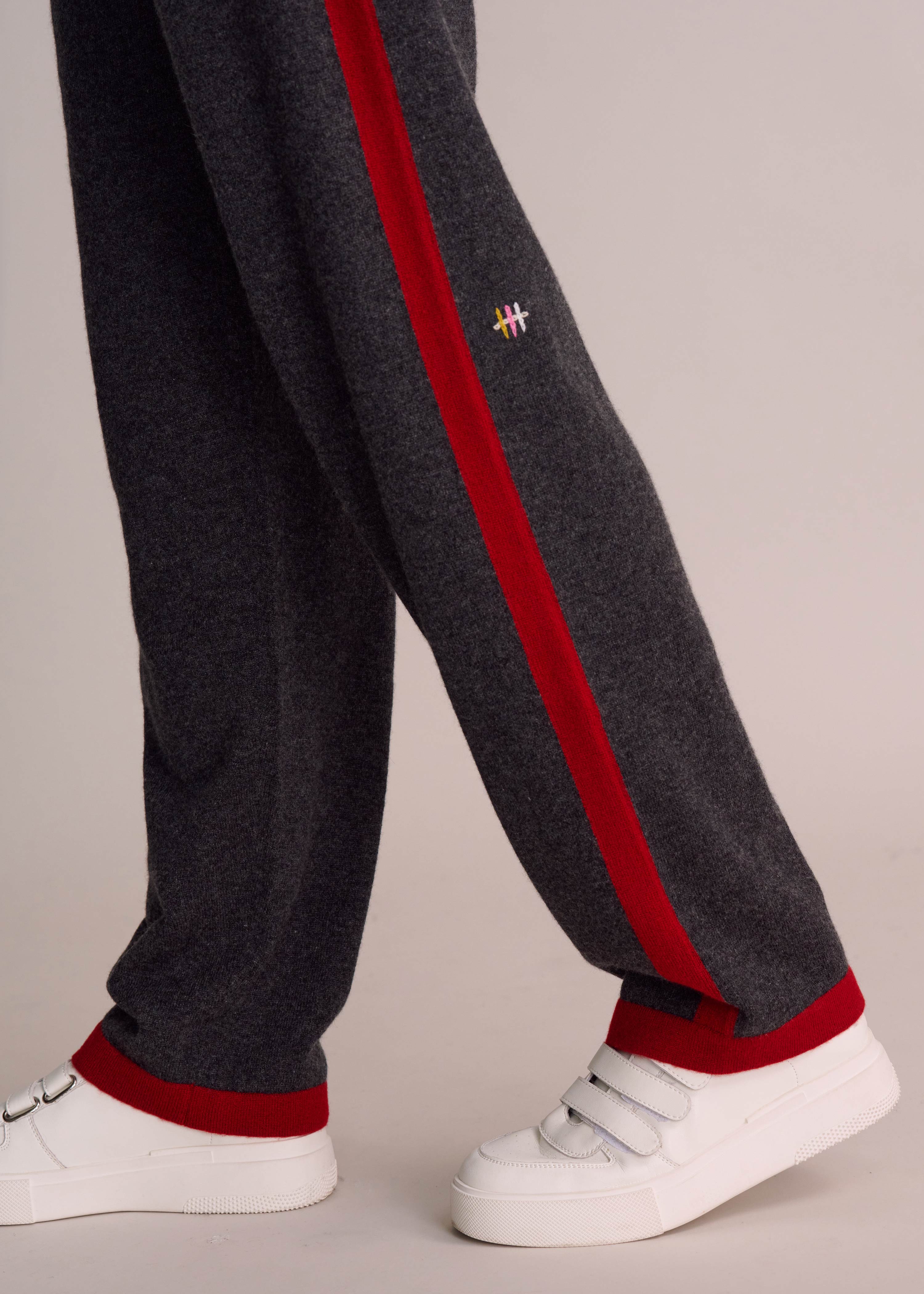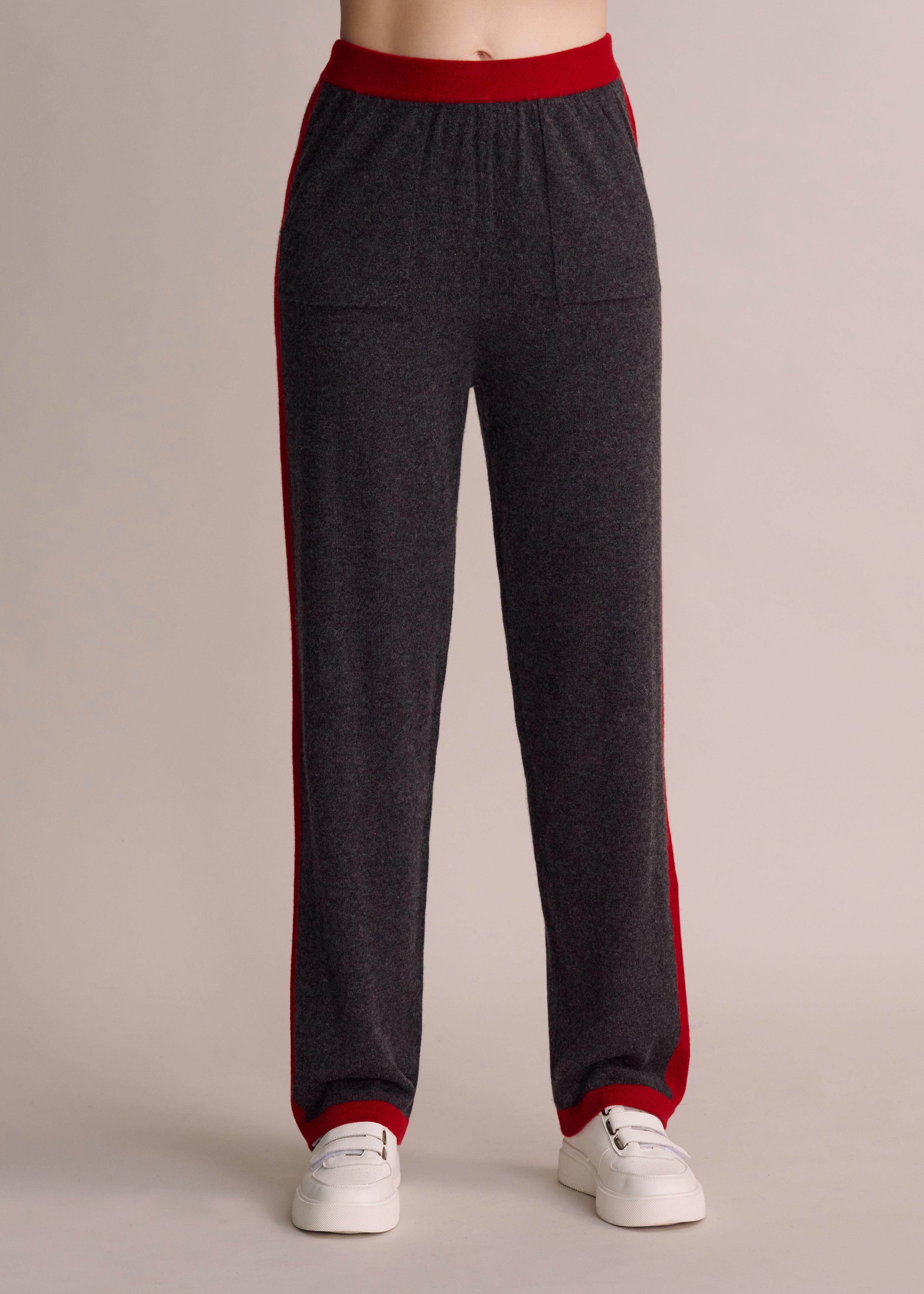 Crafted from 100% cashmere, these straight-cut pants feature subtle color-blocked sides and ribbed hems — a quiet balance between ease and structure.