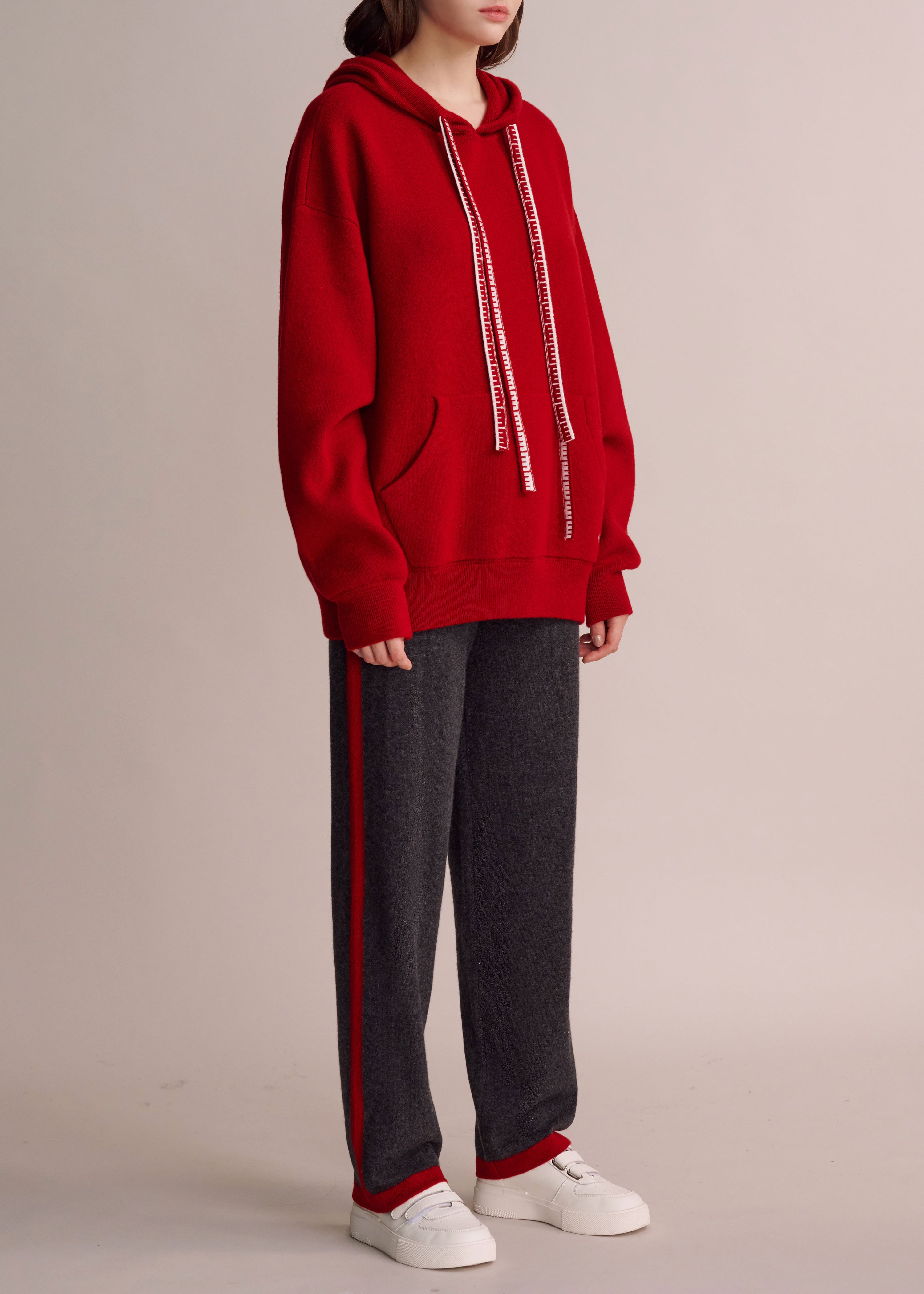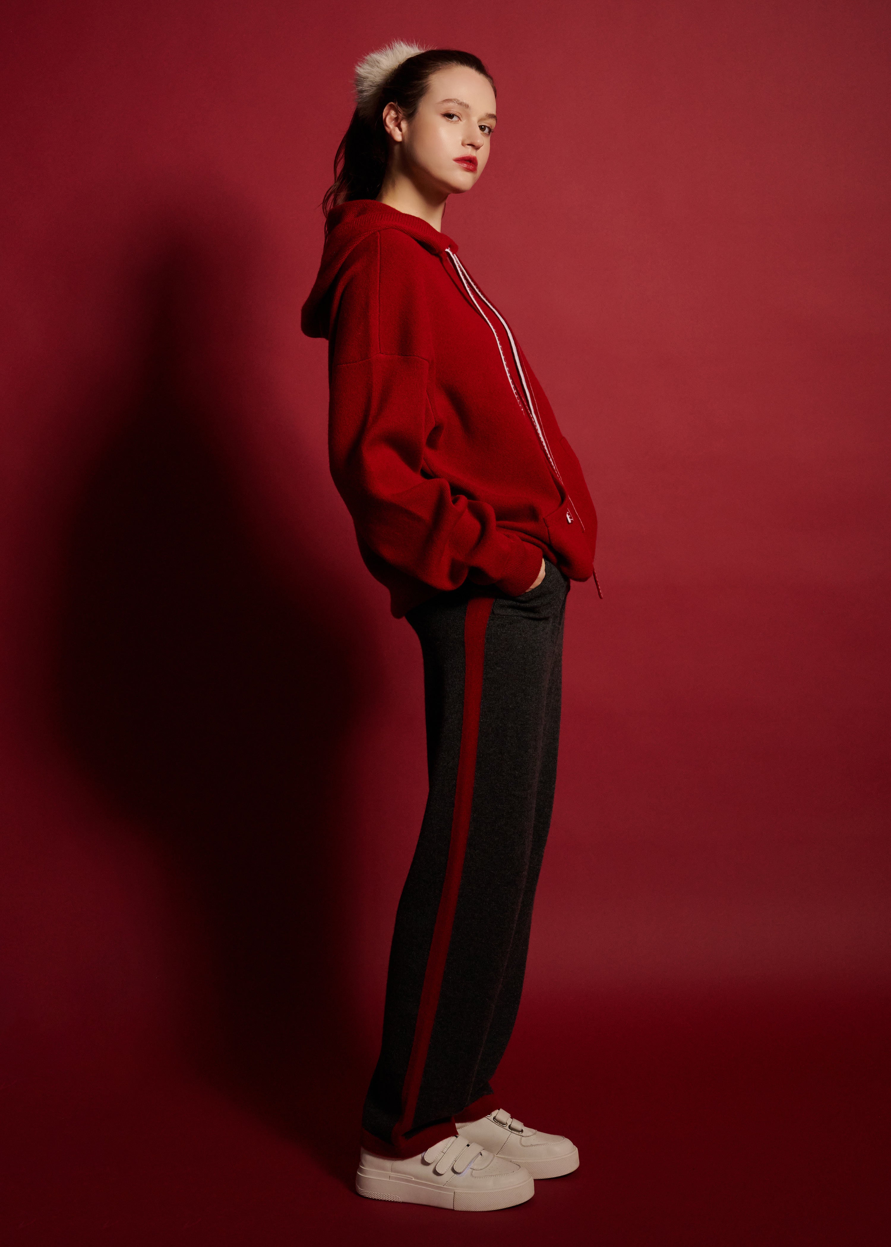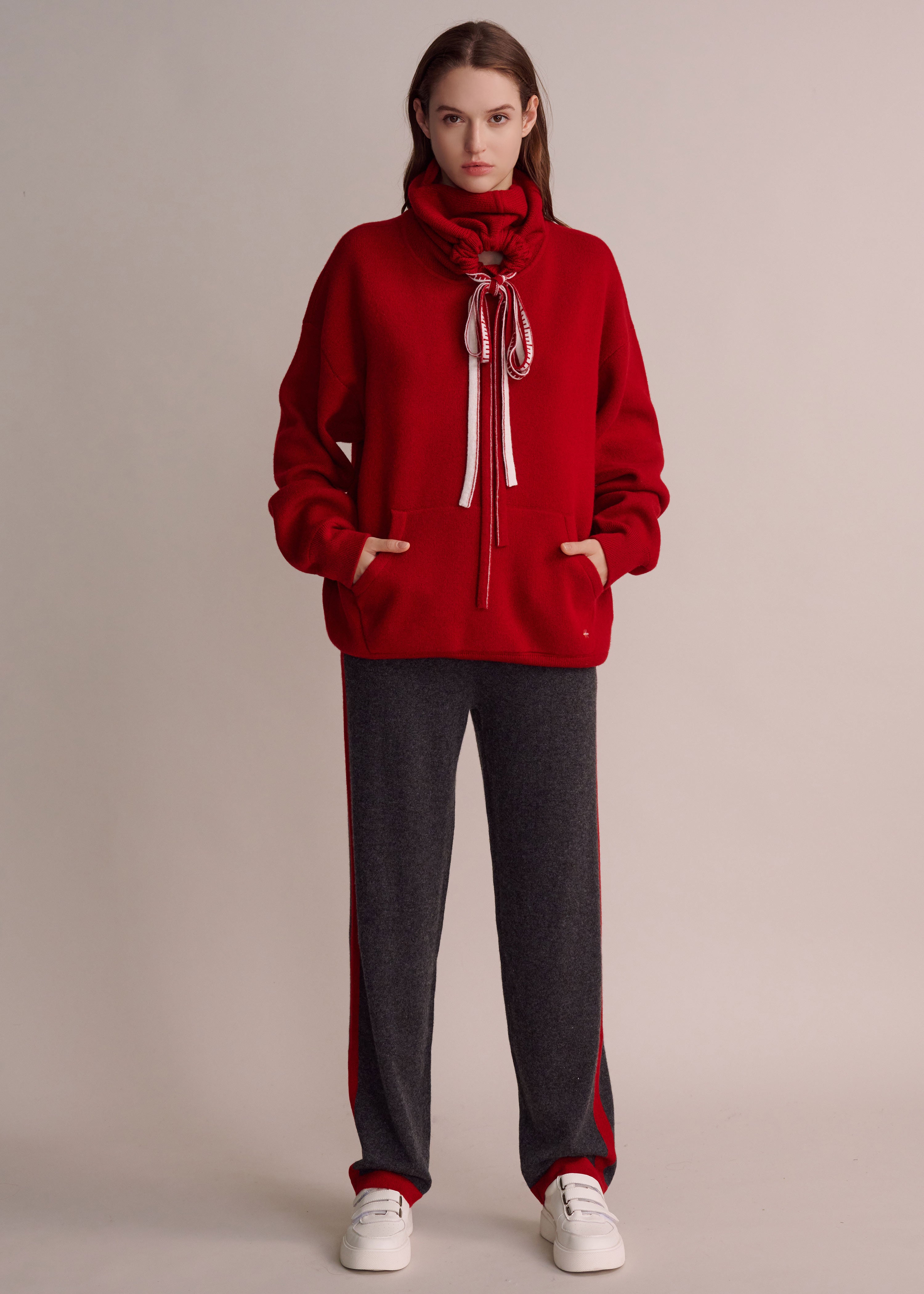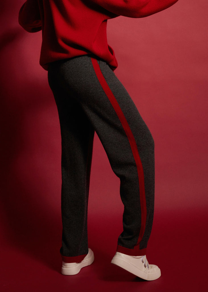 Crafted from 100% cashmere, these straight-cut pants feature subtle color-blocked sides and ribbed hems — a quiet balance between ease and structure.