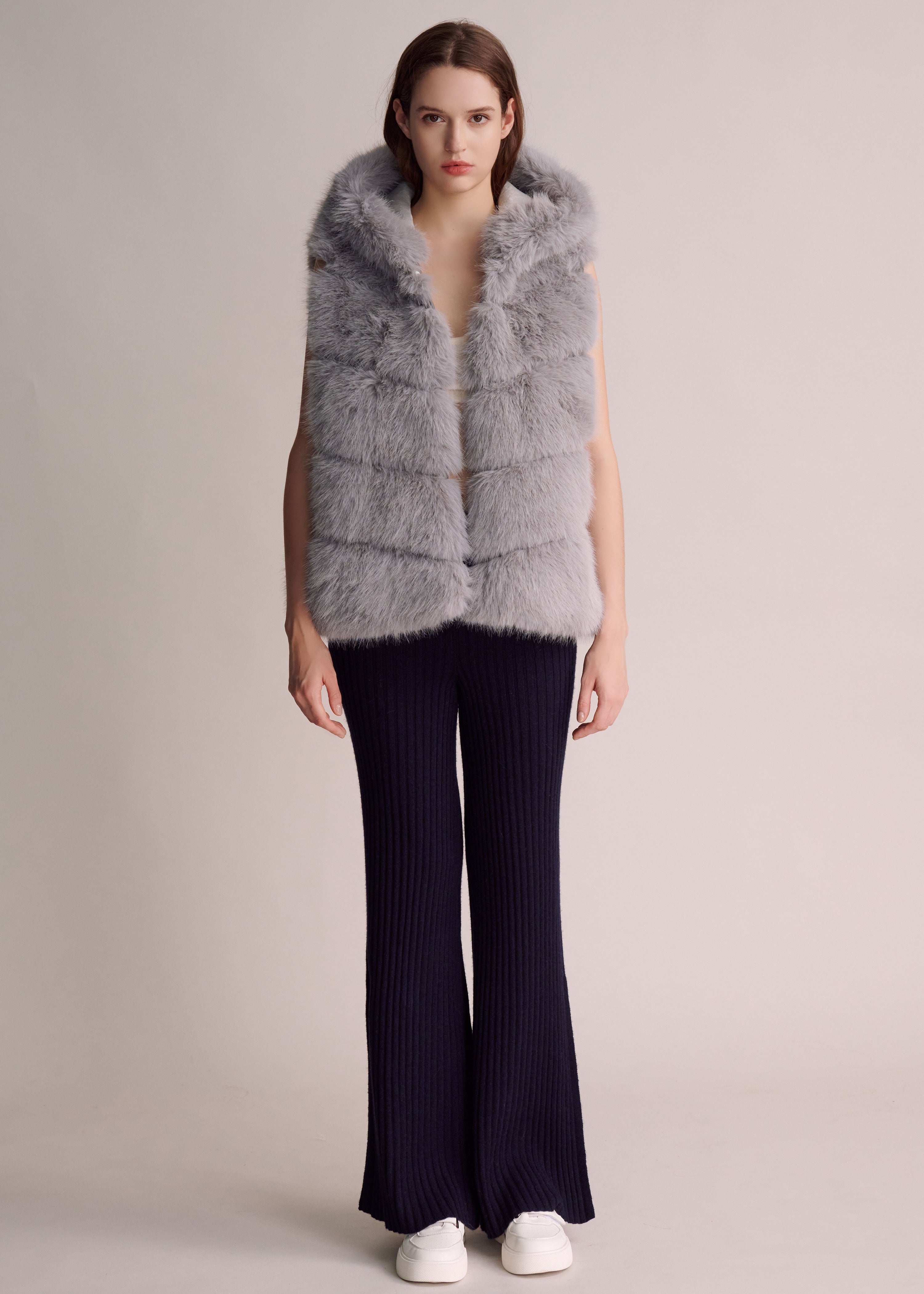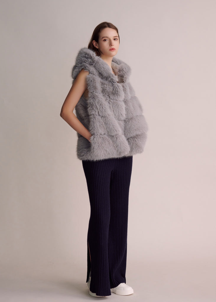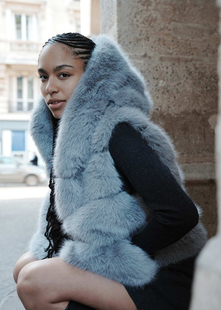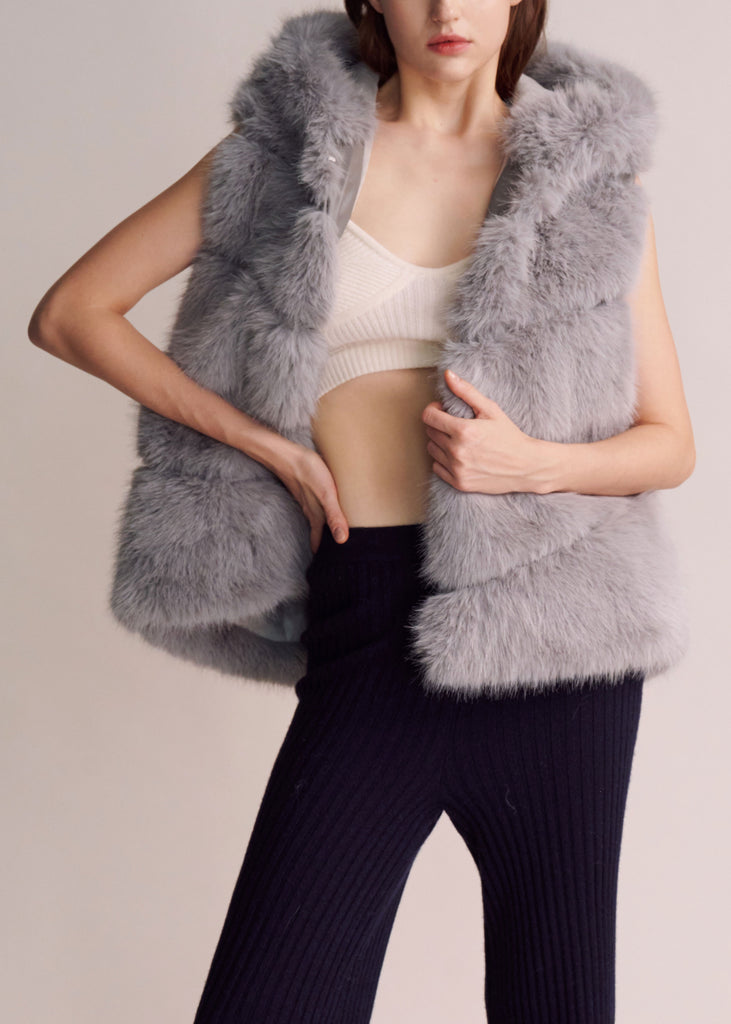 - Crafted with plush vegan fur and a soft brushed lining for warmth, this hooded vest blends comfort with modern edge. The open front is finished with sleek vegan leather trim and side pockets. Exceptionally warm, it’s the perfect piece to elevate your autumn style.