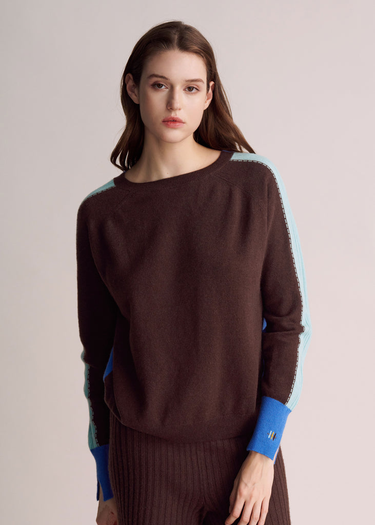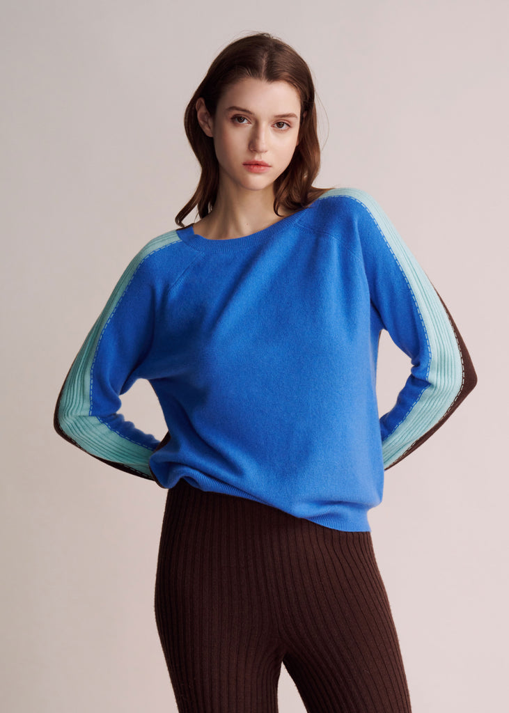 Crafted from 100% premium cashmere, the MALENA sweater explores the beauty of duality — featuring a deep cocoa body with contrasting sky blue and cobalt panels along the sleeves.