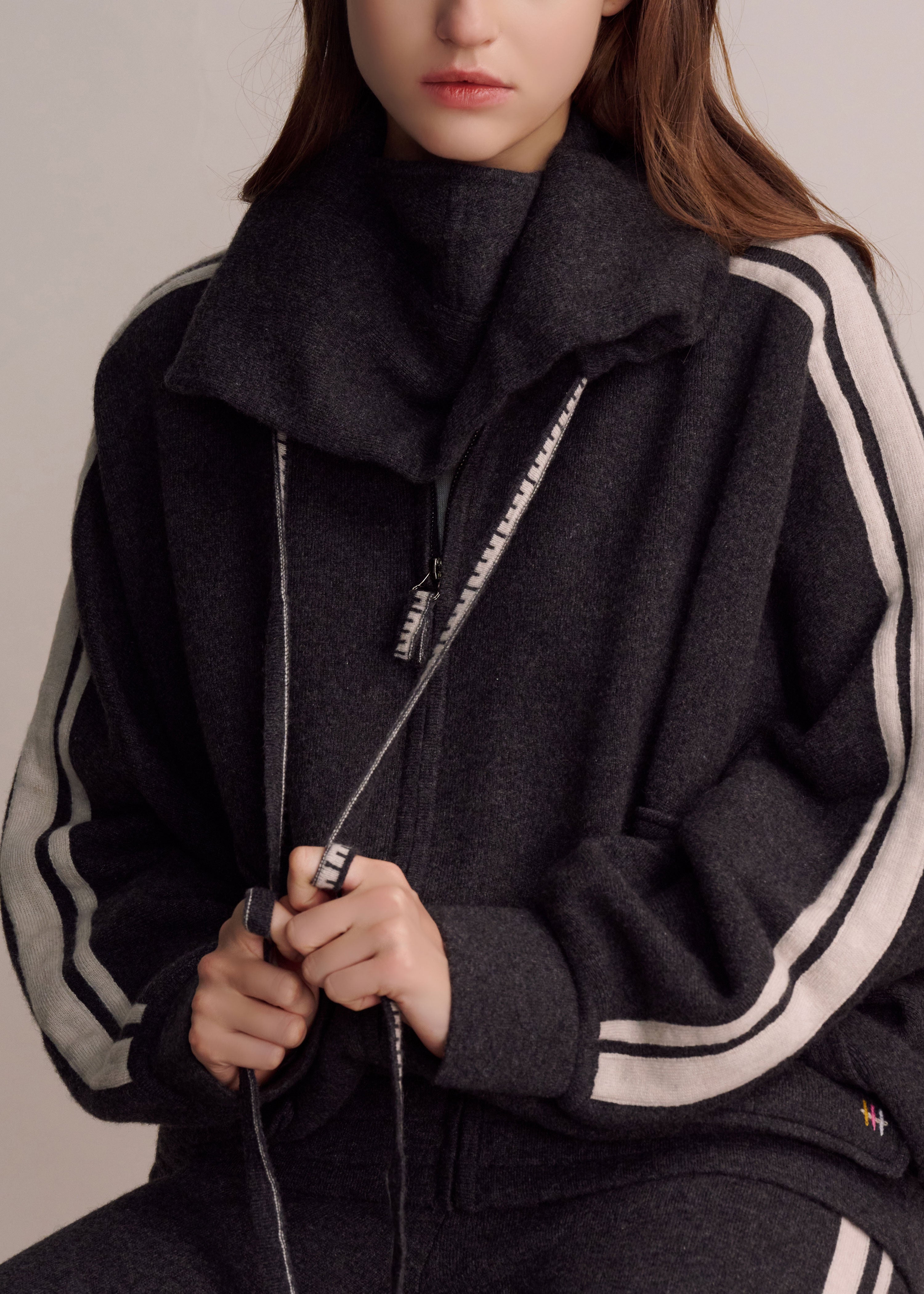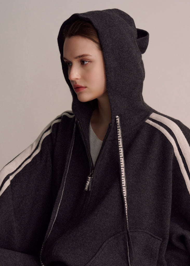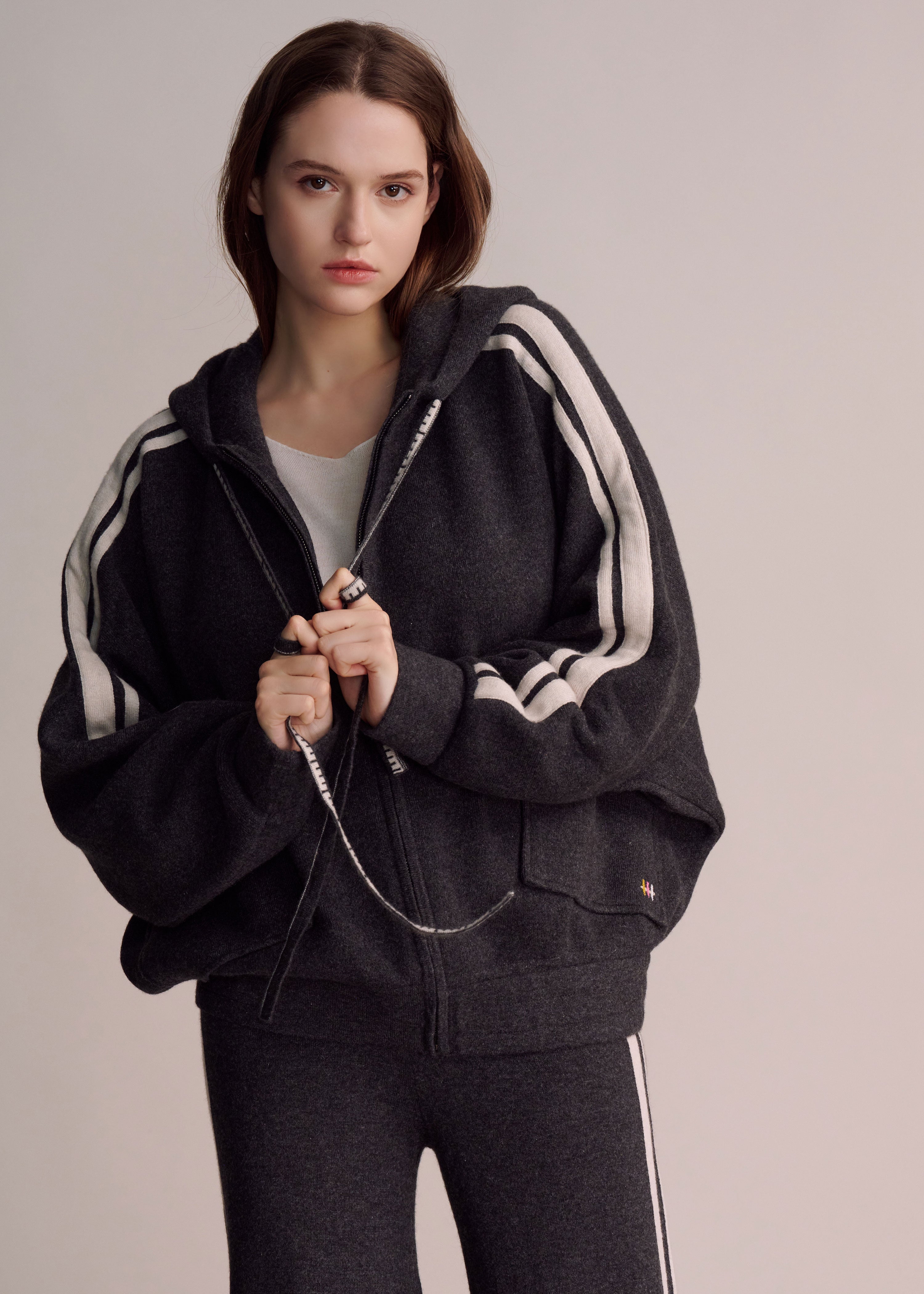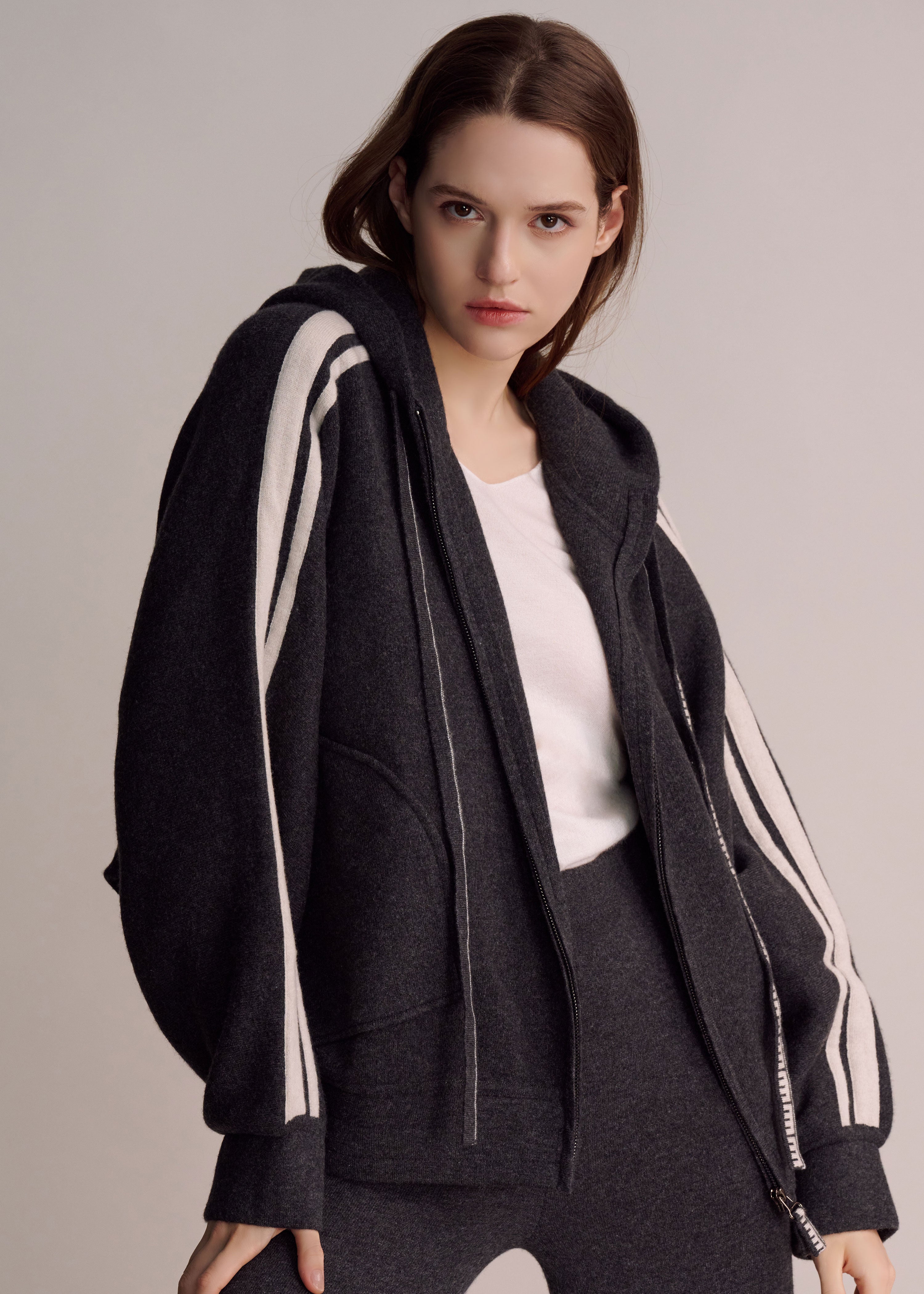 - Blending innovation with luxury, the Rubie jacket is designed for ultimate versatility. Made from ultra-soft cashmere, it features a sleek, structured silhouette with a cozy feel. The unique convertible hood has discreet openings, allowing it to be pulled down and transformed into a snug neck warmer for added functionality. In an elegant charcoal hue, this piece embodies the ConneXions theme—where adaptability and sophistication come together seamlessly.