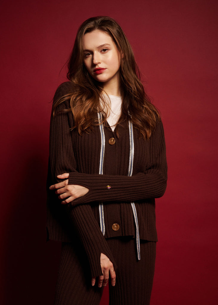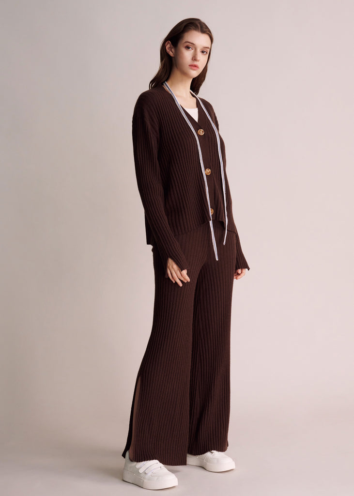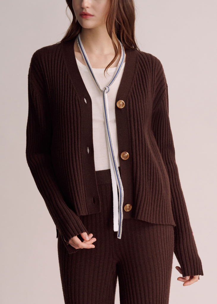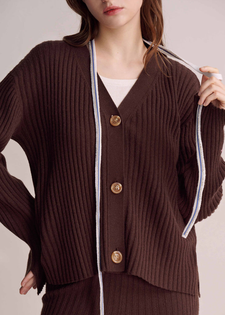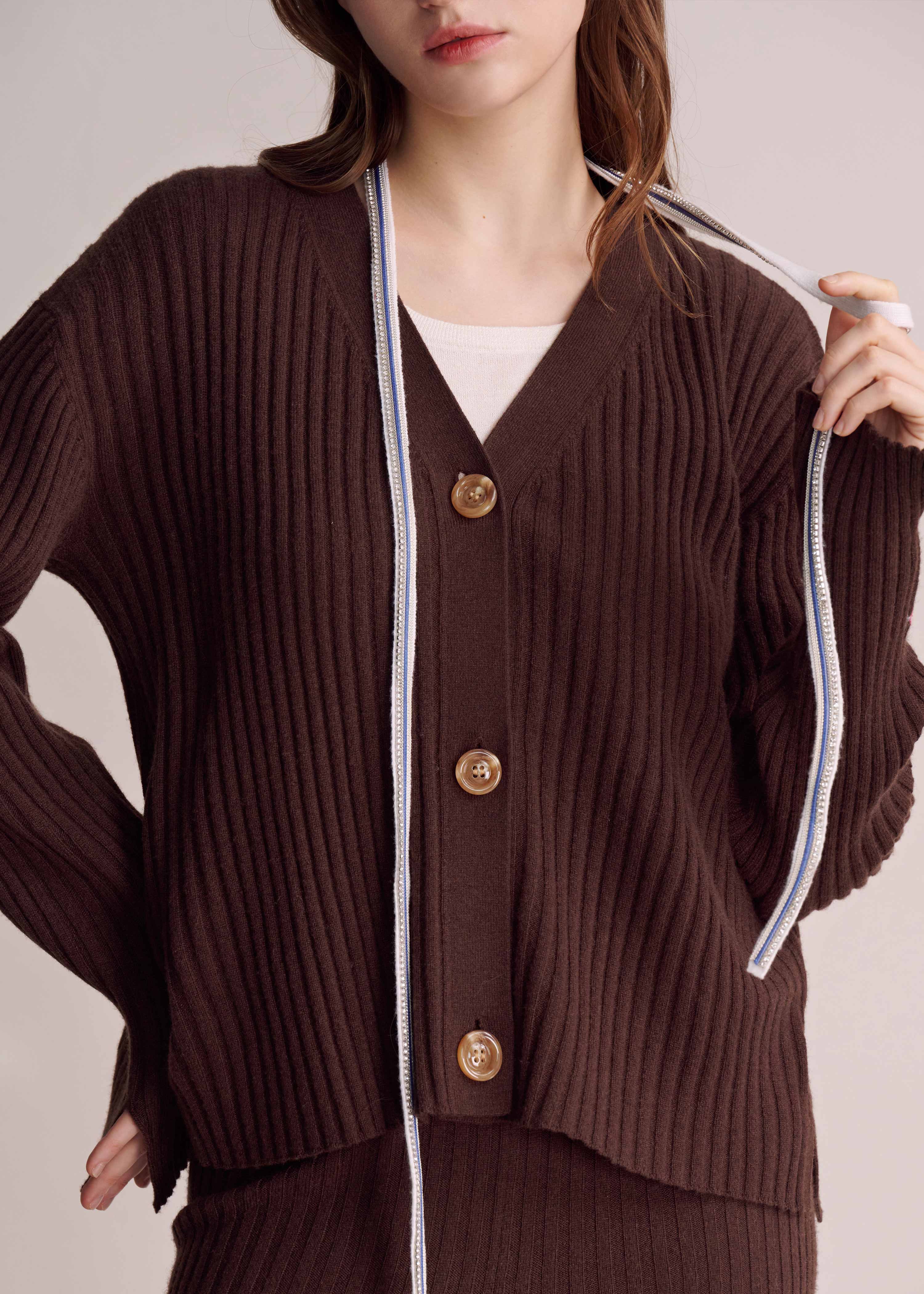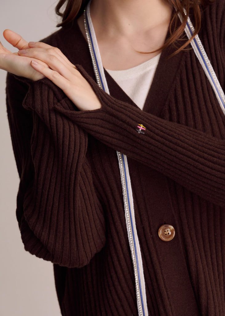 Clara Ribbed Cardigan with Metallic-Trimmed Ribbon - BROWN