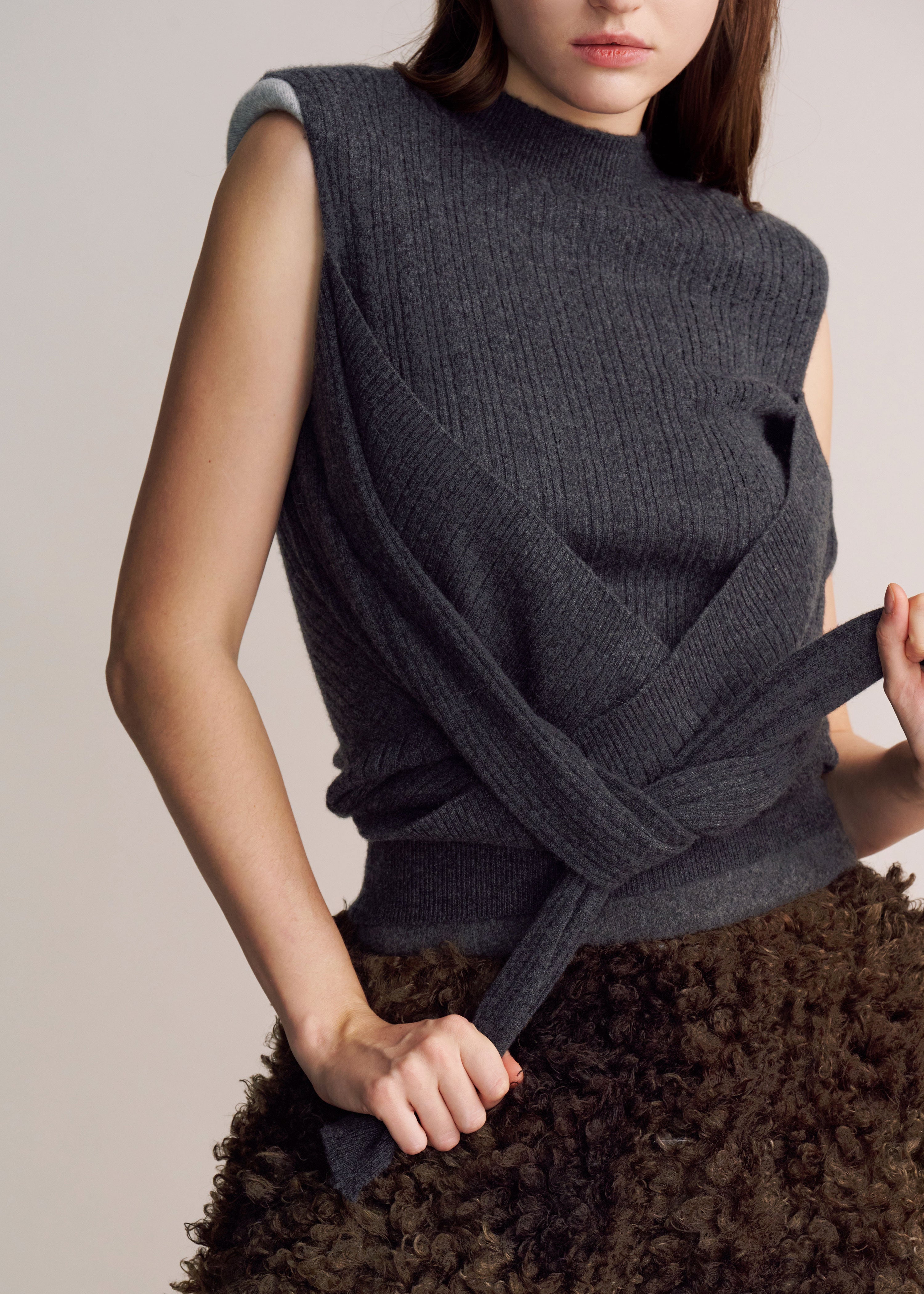 Designed to adapt, it features detachable shoulder pads for effortless silhouette customization. The innovative sleeves offer multiple styling options—wear them traditionally or tie them around your body for a bold, sculptural look.