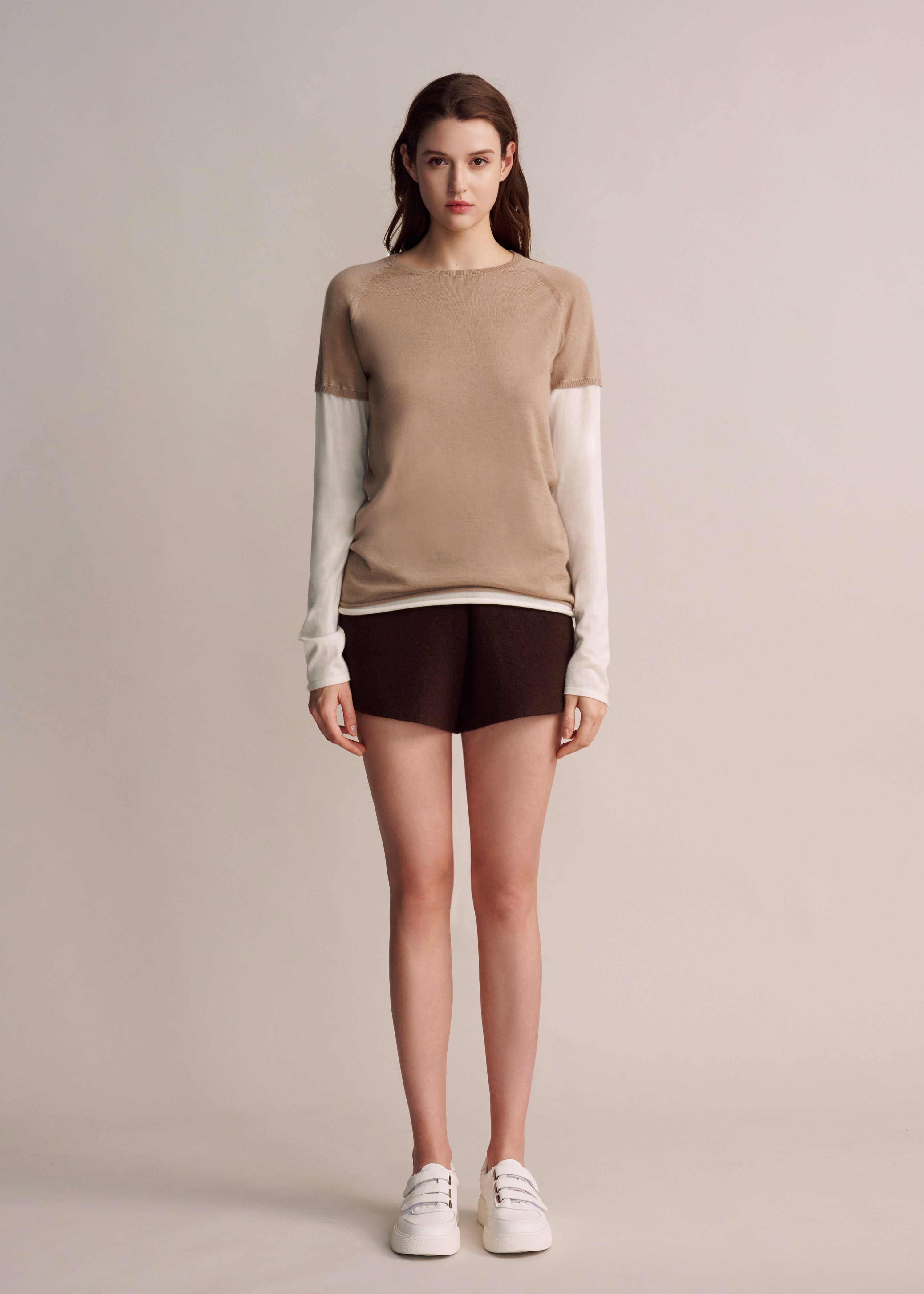 The MIRA Sweater reimagines layering with refined ease. Designed as a mock two-piece, this sweater pairs a rich camel tone with a soft cream inner sleeve — creating the illusion of thoughtful styling, all in one seamless piece.