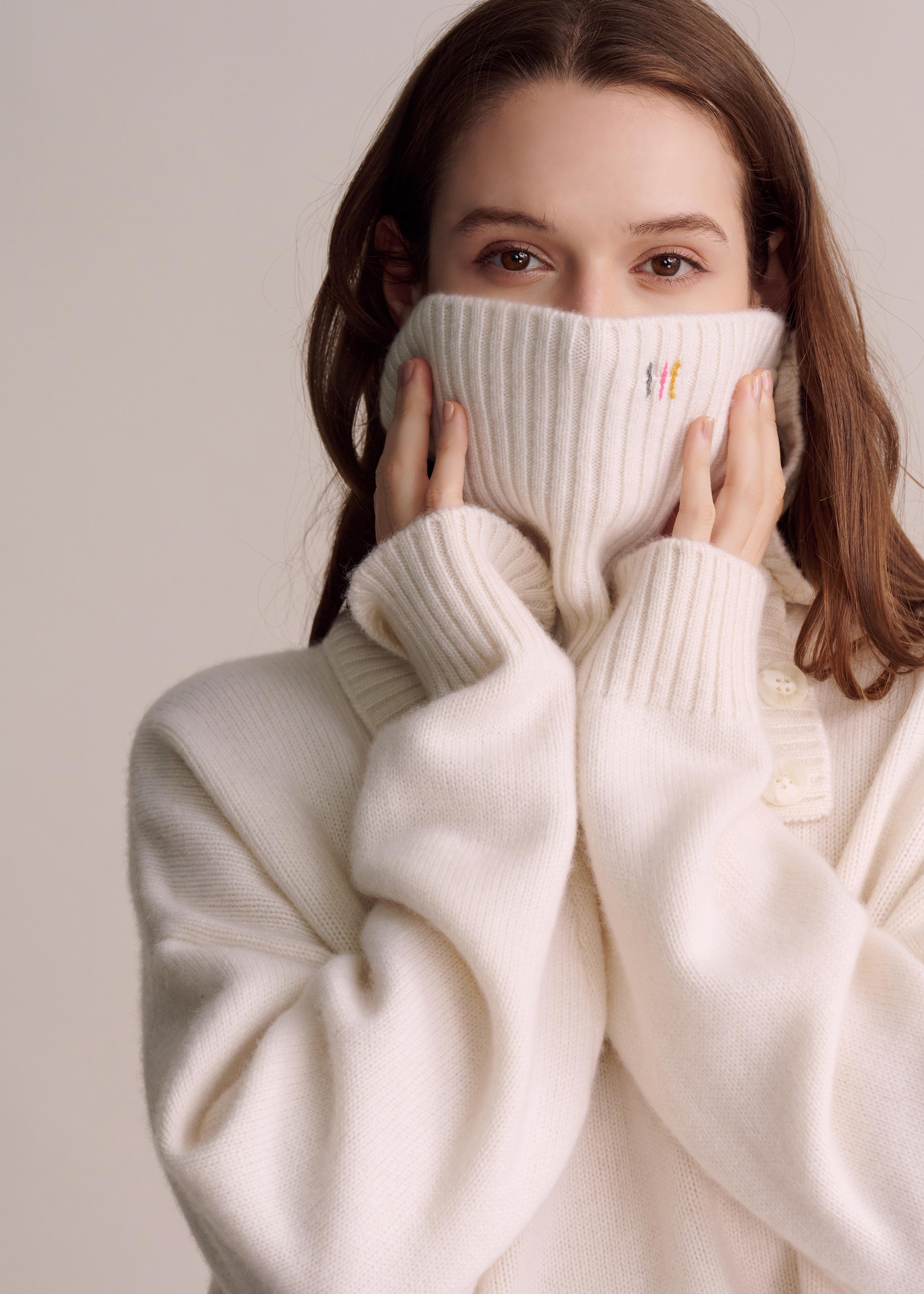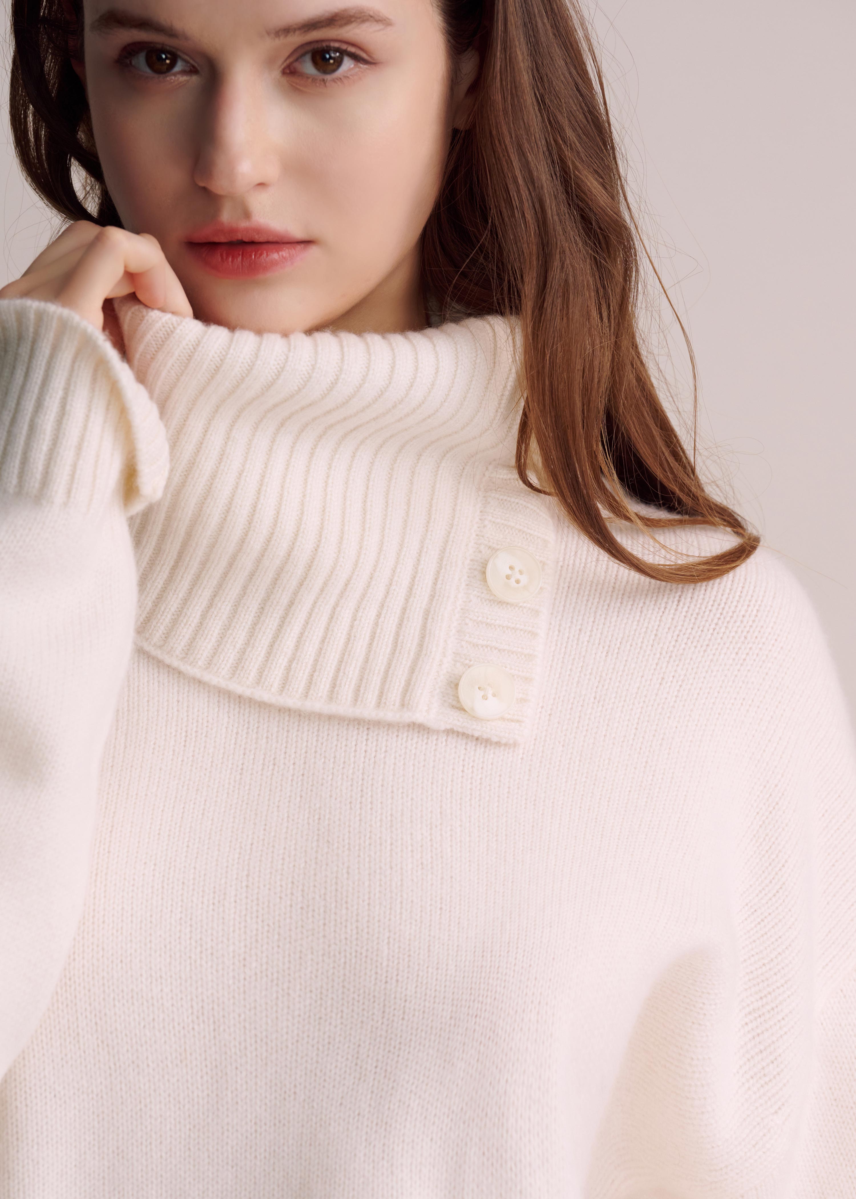 -Introducing the Florie cashmere sweater, crafted from 100% pure cashmere for ultimate comfort and style. Featuring a ribbed neck scarf with adjustable buttons, you can customize your look by choosing how many buttons to fasten. The removable neck scarf adds even more versatility. A perfect blend of flexibility and elegance, embodying the essence of connection.