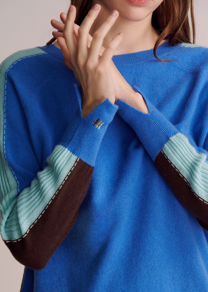 Crafted from 100% premium cashmere, the MALENA sweater explores the beauty of duality — featuring a deep cocoa body with contrasting sky blue and cobalt panels along the sleeves.