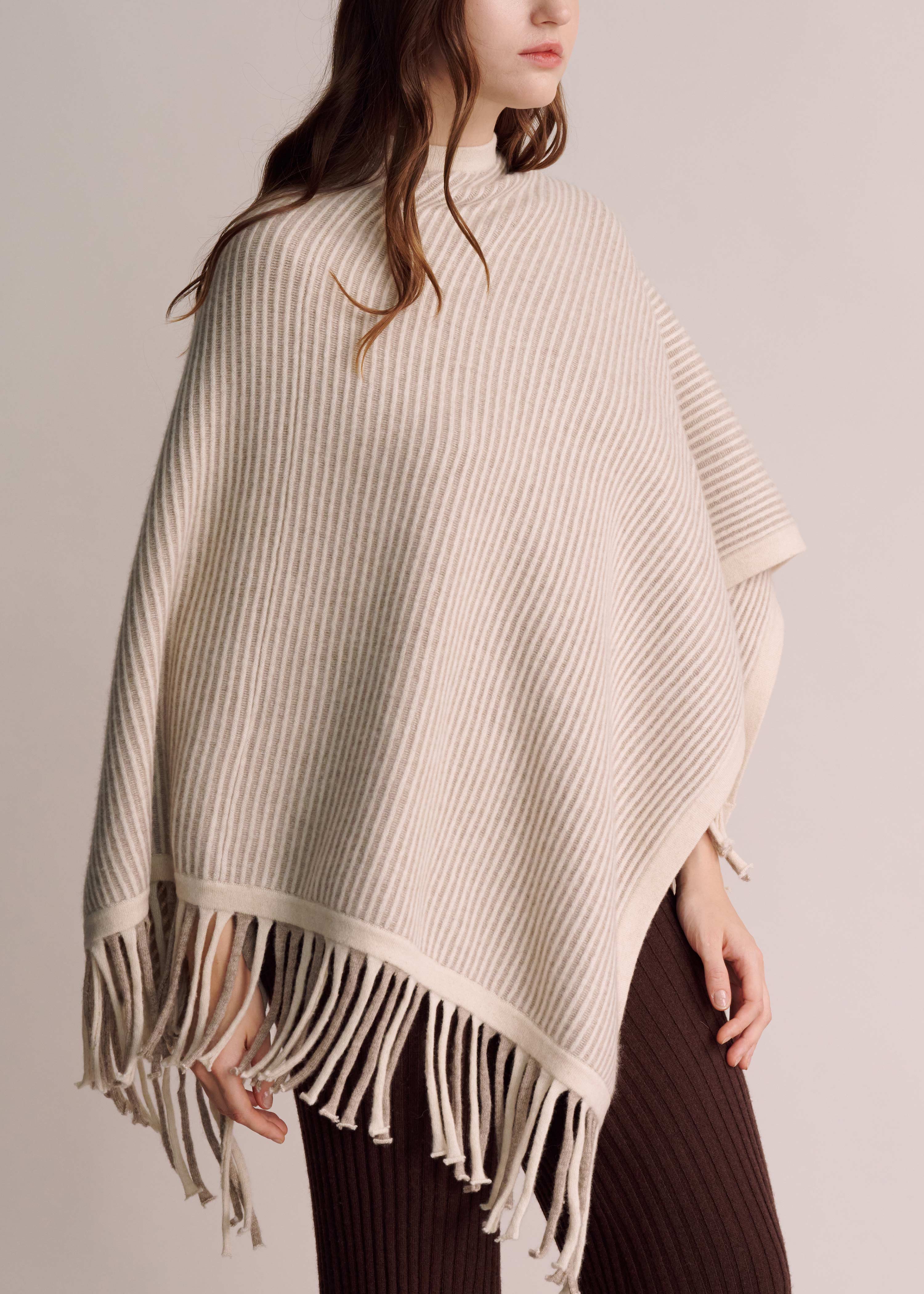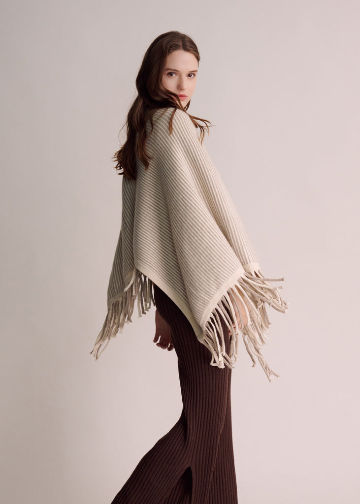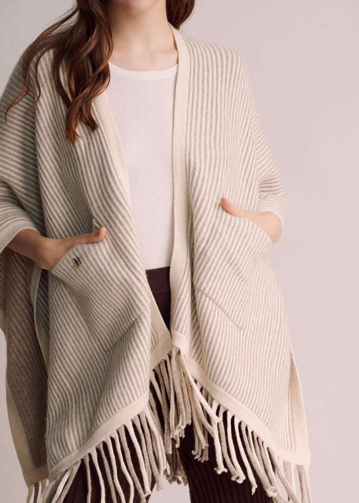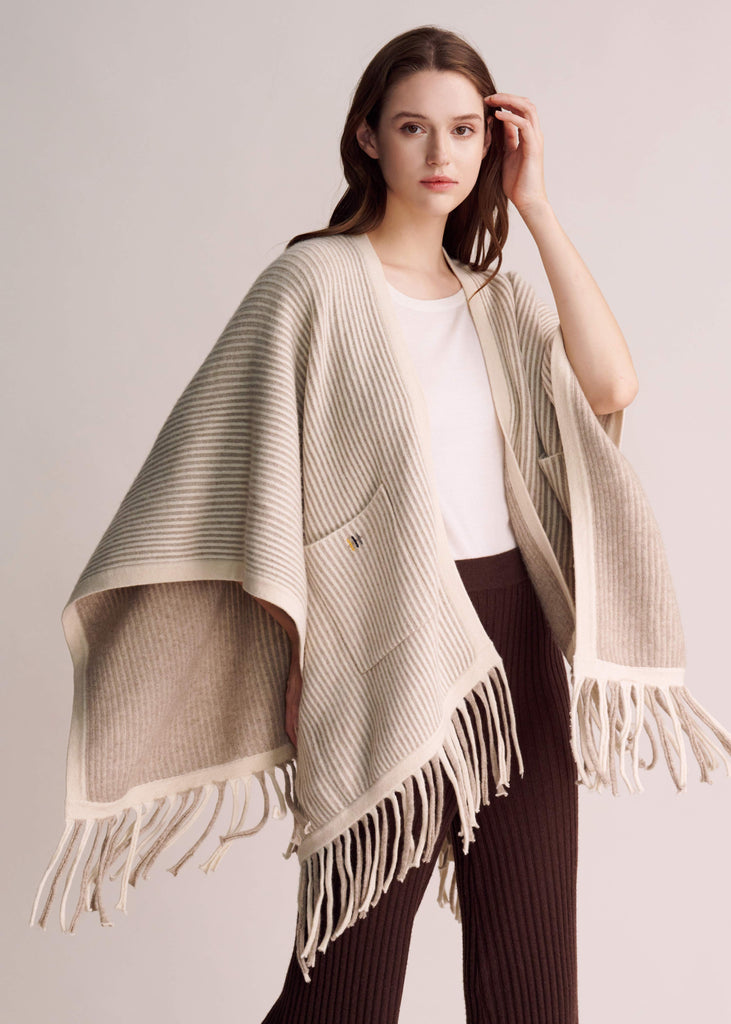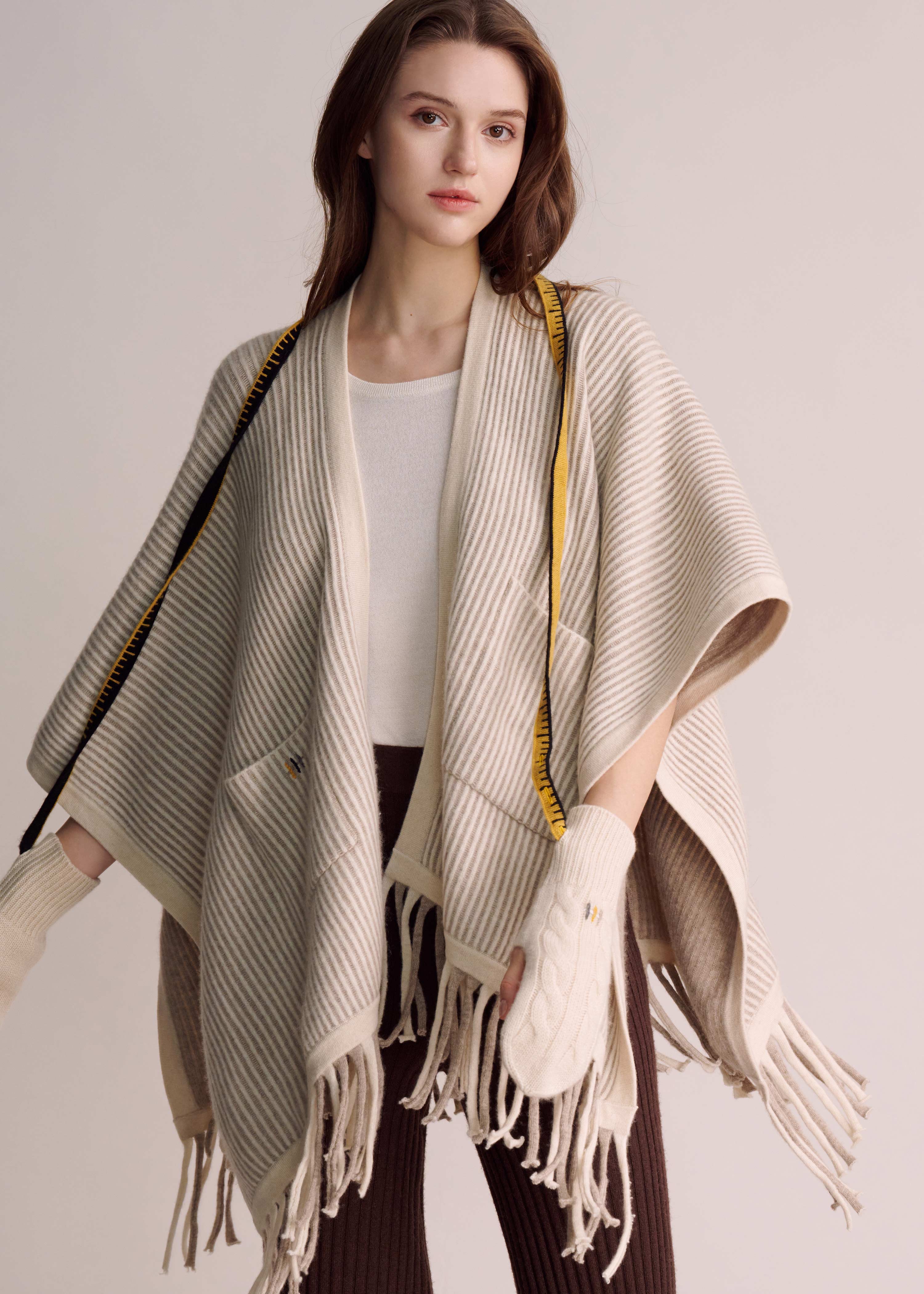 - Rooted in the theme of ConneXions, this cashmere poncho blends timeless craftsmanship with modern versatility. Designed with a classic striped pattern, it features a fringed hem that adds effortless movement and two functional pockets for everyday ease. An additional ruler ribbon offers styling flexibility, allowing you to personalize your look. Soft, warm, and refined, it embodies the art of layering and the beauty of meaningful connections.