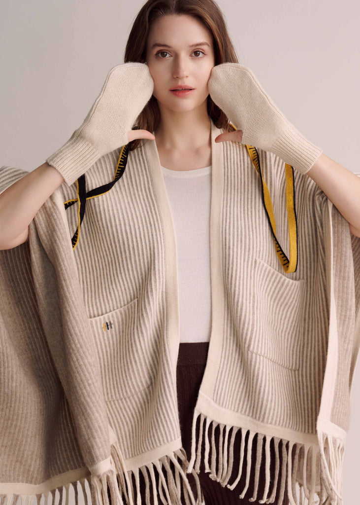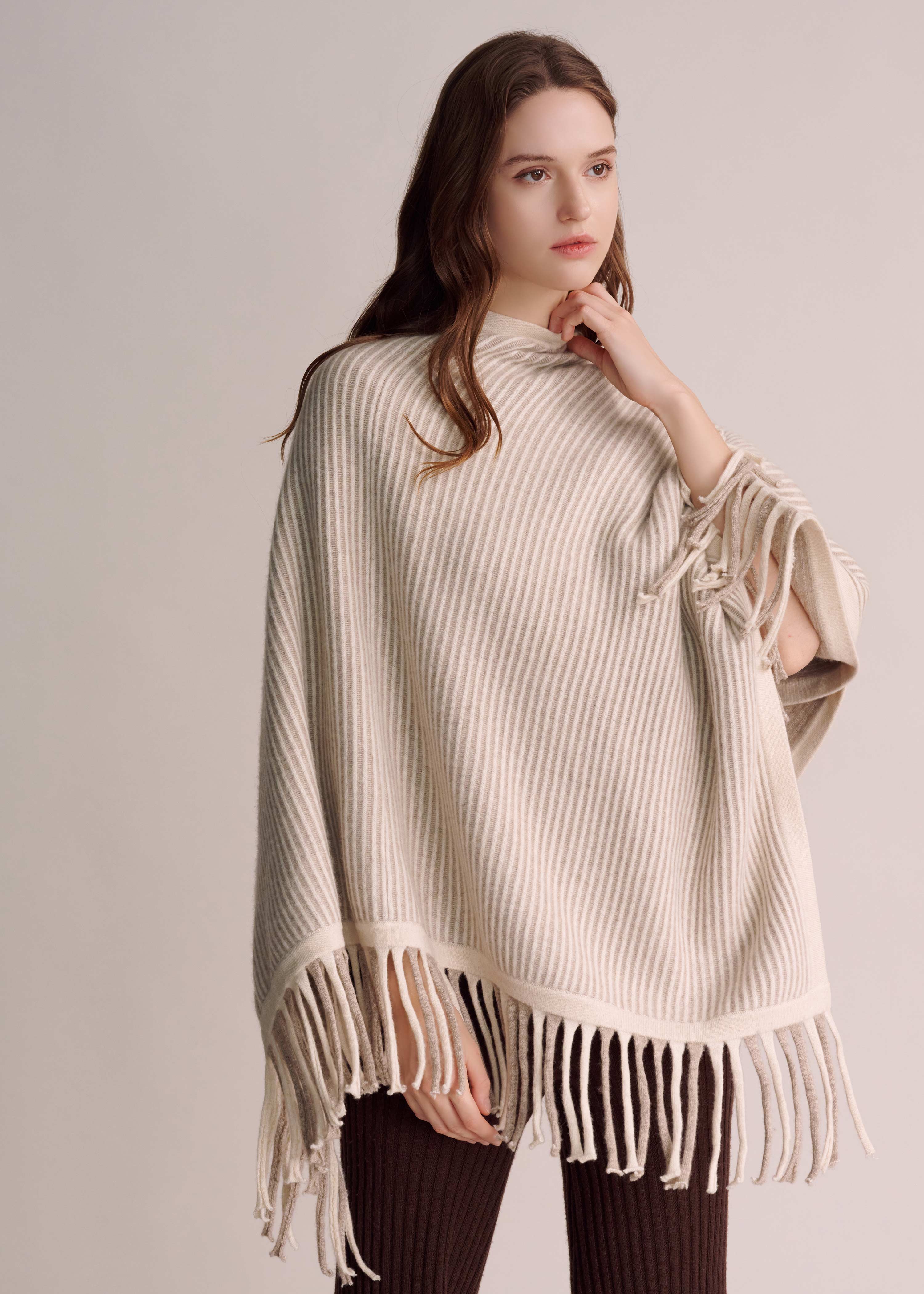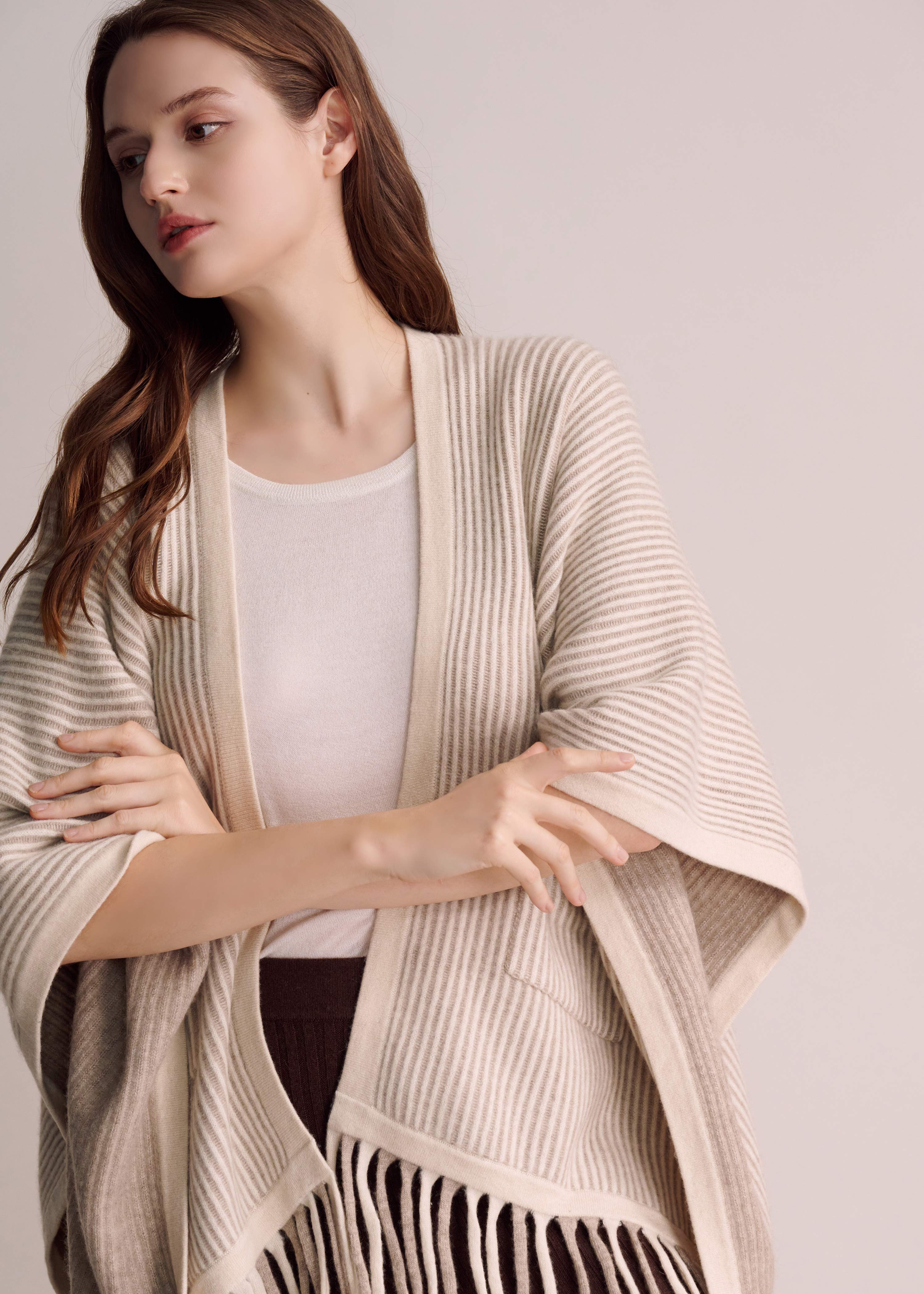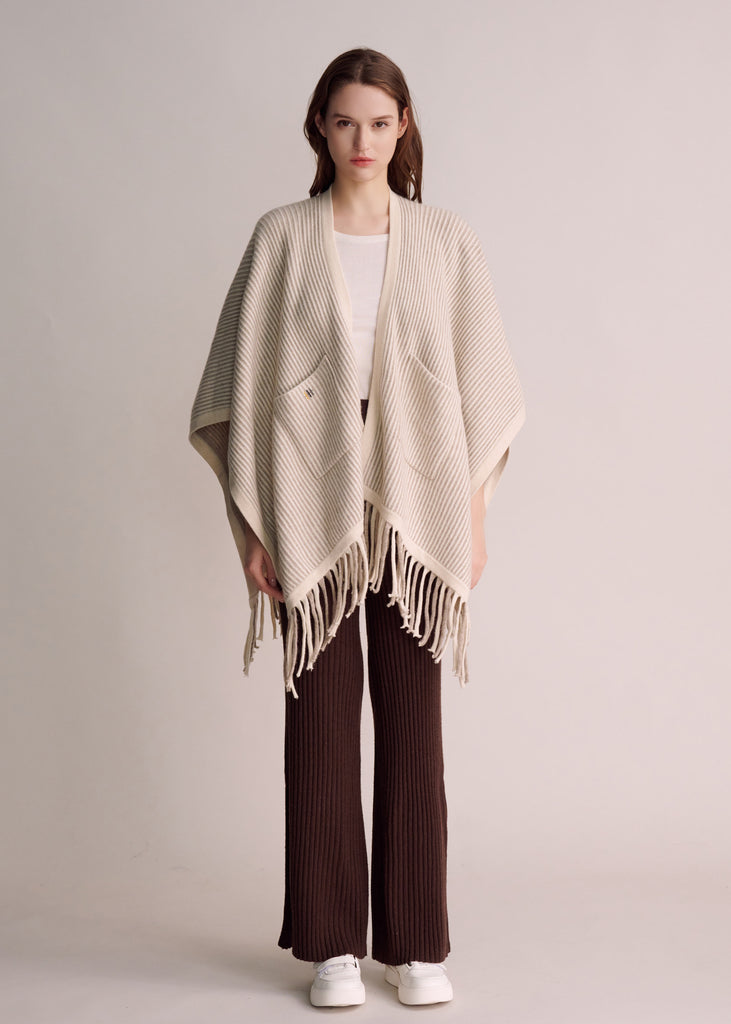 - Rooted in the theme of ConneXions, this cashmere poncho blends timeless craftsmanship with modern versatility. Designed with a classic striped pattern, it features a fringed hem that adds effortless movement and two functional pockets for everyday ease. An additional ruler ribbon offers styling flexibility, allowing you to personalize your look. Soft, warm, and refined, it embodies the art of layering and the beauty of meaningful connections.